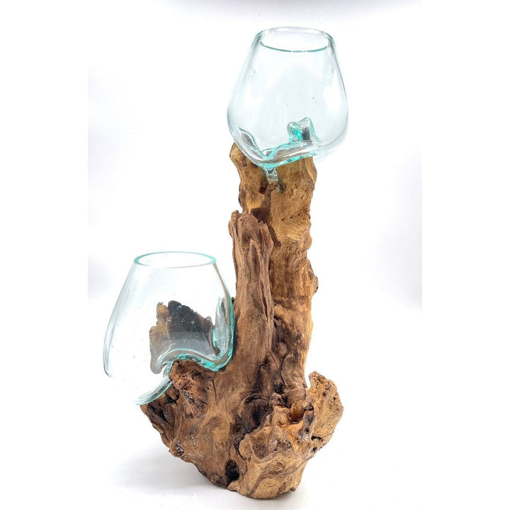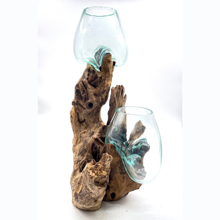 The gamal tree grows all over the islands of Indonesia. The gamal tree from the eastern side of Bali is used to create these pieces branches are cut and polished into slabs. the root sections are used to make the bases for our hand blown glass vessels. Each root base is cut cleaned and kiln dried. Then an Indonesian Artisan hand blows and fire a glass vessel to perfect form onto each base. The fired glass takes the unique shape of the root base and becomes one. The glass is then dipped and cooled into water to solidity the unique shape. Each piece is truly a work of art.